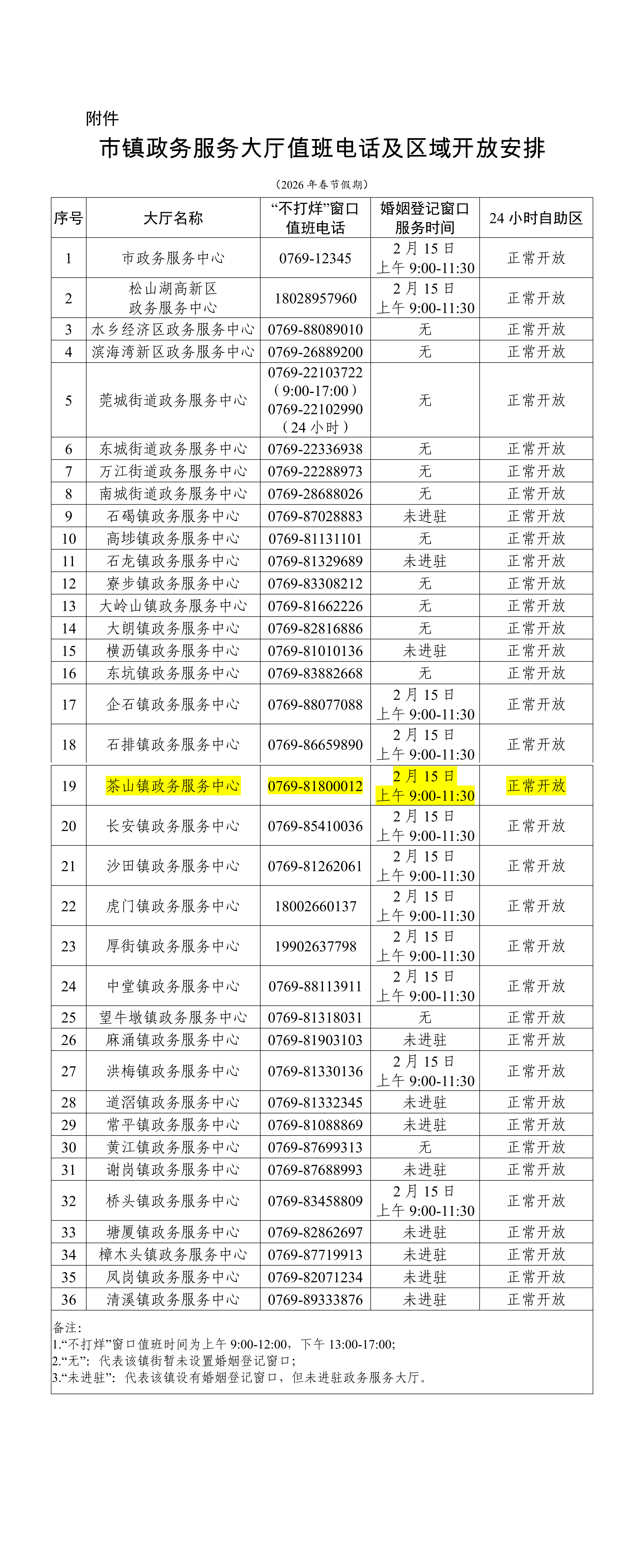 放假期间,茶山镇政务服务中心政务大厅窗口暂停对外开放(含周末延时服务),24小时自助服务区正常开放。茶山镇婚姻登记处于2月15日(星期日)上午9:00-11:30正常对外服务(仅办理预约号,市民朋友可通过“粤省事”APP/小程序预约办理)。
