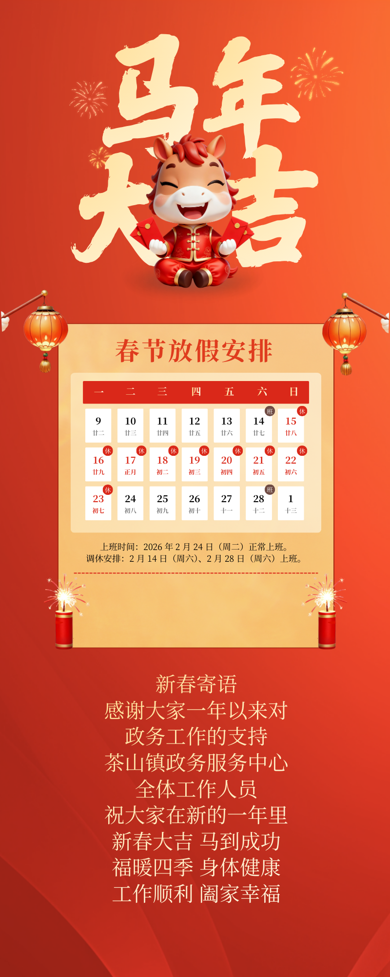 根据《国务院办公厅关于2026年部分节假日安排的通知》(国办发明电〔2025〕7号)文件精神,茶山镇政务服务中心2026年春节假期安排如下: